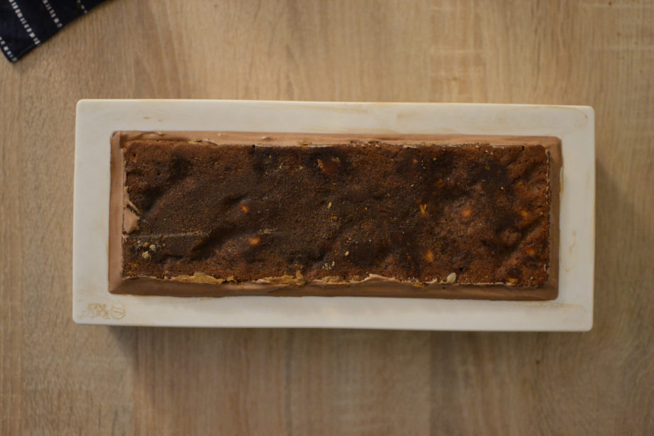 Sortez et démoulez votre insert crémeux cacahuète bien congelé. Gardez-le au frais. Placez dans votre moule à bûche votre mousse chocolat – cacahuètes, en prenant bien soin de faire remonter la mousse partout sur les bords du moule. Placez ensuite bien au centre votre insert crémeux cacahuètes et caramel, puis par dessus votre biscuit recouvert de votre praliné croustillant, bien froids eux aussi. Appuyez légèrement pour que la mousse remonte sur les côtés et se répartisse partout. Puis placez au congélateur. Une fois la bûche au congélateur, vous pouvez la conserver là jusqu’au jour J (ou la veille). Il ne restera alors qu’à la démouler et à la glacer.