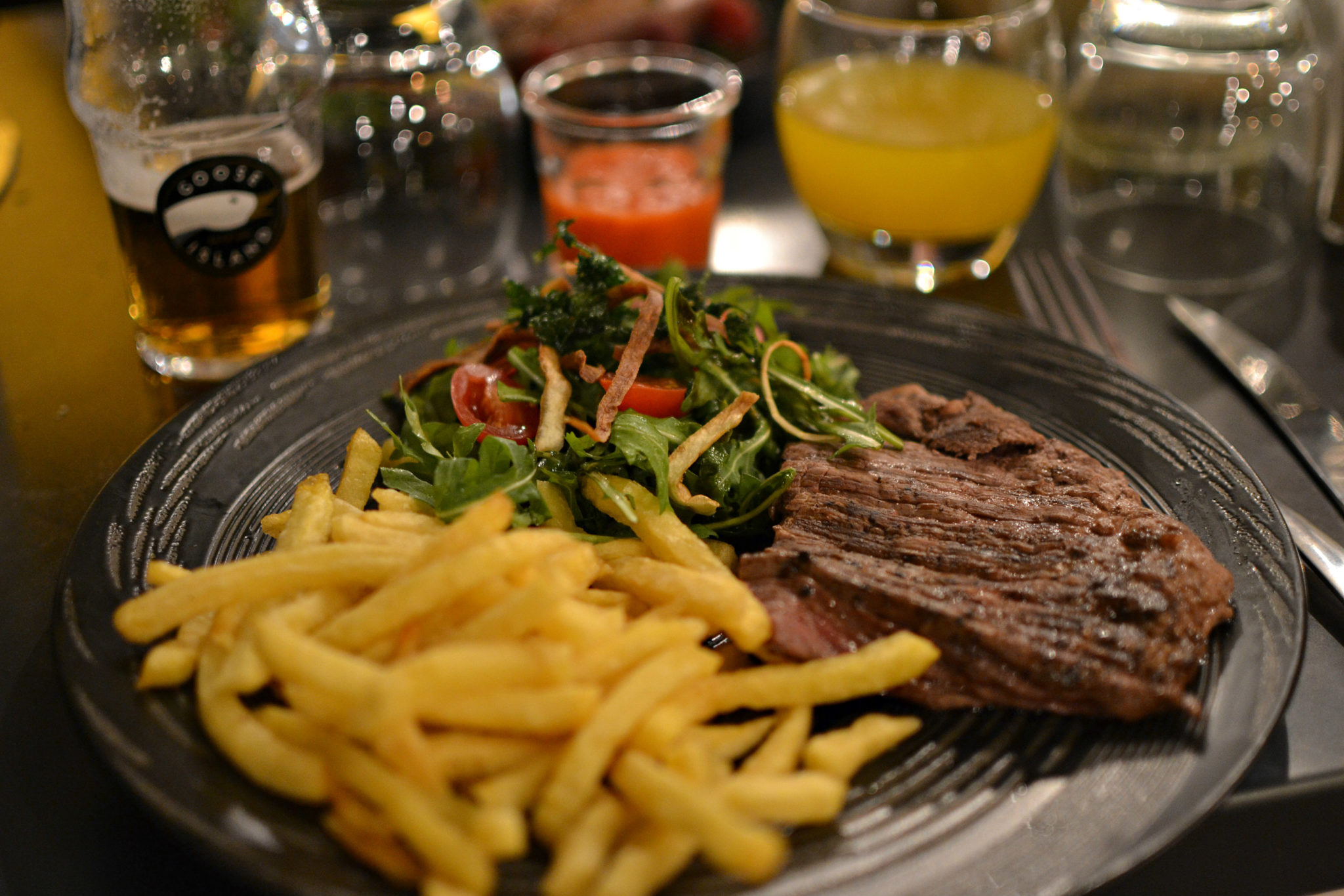 Le resto correspond bien à l’ambiance générale de la salle : c’est moderne et cosy à la fois, assez sobre. Assez bobo aussi, dans l’ambiance et surtout les produits proposés : c’est des bons produits, qualitatifs et dans l’air du temps (jus de fruits et limonades bio…). Tout est fait maison sur place et la carte est assez éclectique : on y trouve aussi bien des veloutés, des burratas, salades, tartares, pièce de viande rouge, évidemment des burgers et des plats végétariens et même des poke bowl (au quinoa, la case à cocher pour être tendance). Pour les petites faims ou pour partager un apéro entre amis, les planches et charcuteries sont idéales. On a testé le tartare de noix de Saint-Jacques, pas mal du tout, tout en finesse ; le tartare de veau, bien gourmand avec ses petites framboises, un bon gros magret de canard avec ses frittes croustillantes et un faux-filet de boeuf ultra tendre ; et pour finir, une mousse au chocolat, juste parfaite ! C’est un resto sans prétention, mais ça fait clairement le job et c’est bon. Et franchement après une bonne séance d’escalade, un gros burger gourmand ou un filet de boeuf avec des frites, c’est exactement ce dont vous aurez envie !