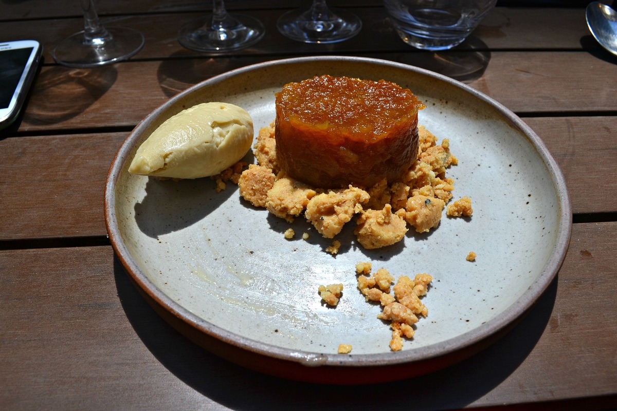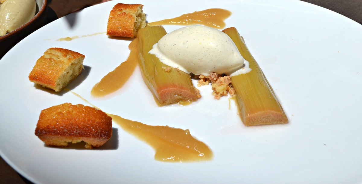 Une pomme fondante et bien caramélisée sur son sablé à la fève tonka… Une glace à la rhubarbe ultra fraiche et bien acide pour contre balancer le côté sucré des pommes caramélisées. Le dessert est comme une Tatin déstructurée et modernisée.