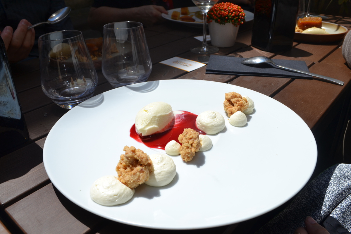 Le deuxième dessert est une crème diplomate au citron, avec un crumble émietté bien croustillant, une quenelle très douce de glace au yahourt et un coulis de framboise. Des associations bien maîtrisées pour un super dessert.