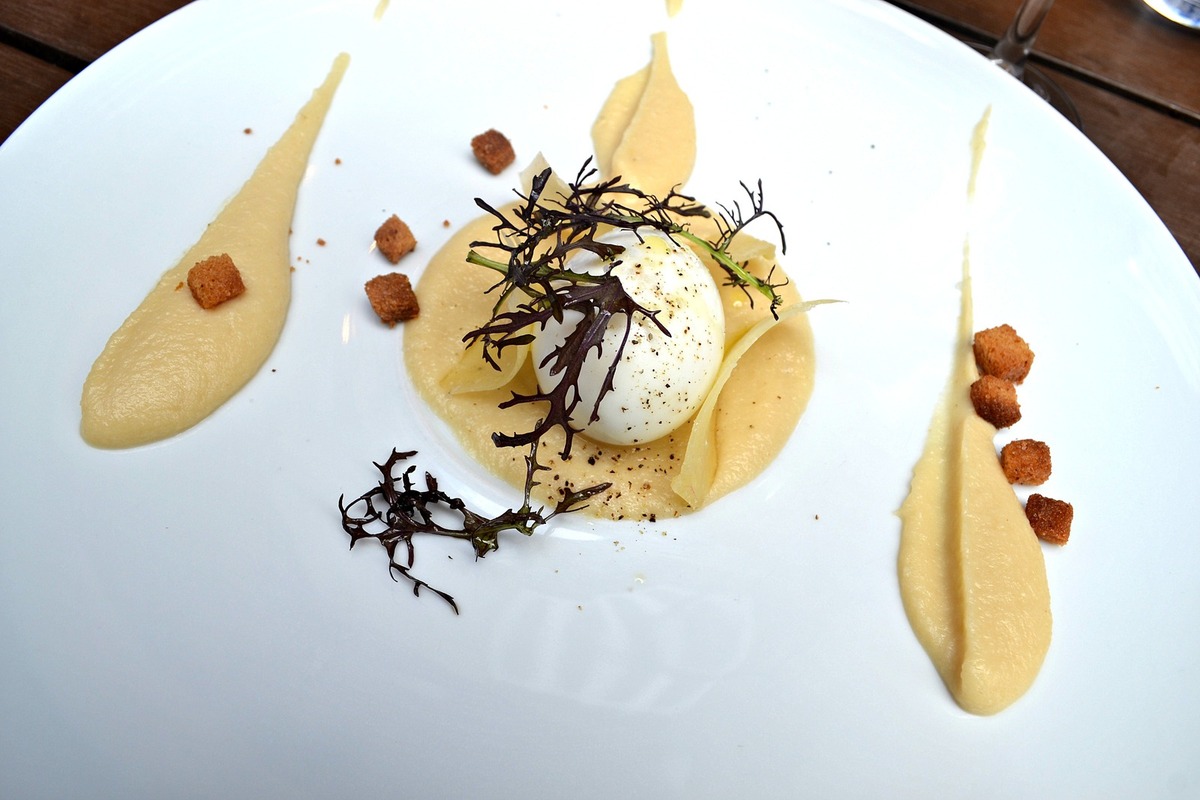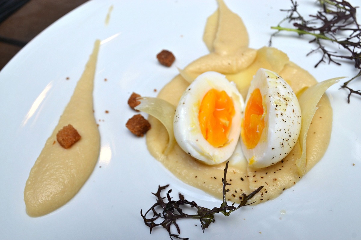 Un œuf mollet à la crème de céleri, truffe blanche et parmesan. Now we’re talking… On nous présente une jolie assiette dans les tons pastel. Et on observe direct le rituel de l’œuf mollet : on coupe pour voir si le jaune coule. Un peu déçu car le mien ne coule pas (mais celui du voisin si, mauvaise pioche). Je me console en goûtant la crème de céleri. Légère et bien lisse, avec un bon parfum de truffe blanche (probablement de l’huile de truffe). Ca marche nickel avec le parmesan et l’œuf. Rien de spécialement étonnant dans les saveurs, mais c’est un très bon plat, surtout à ce prix là (6 euros).