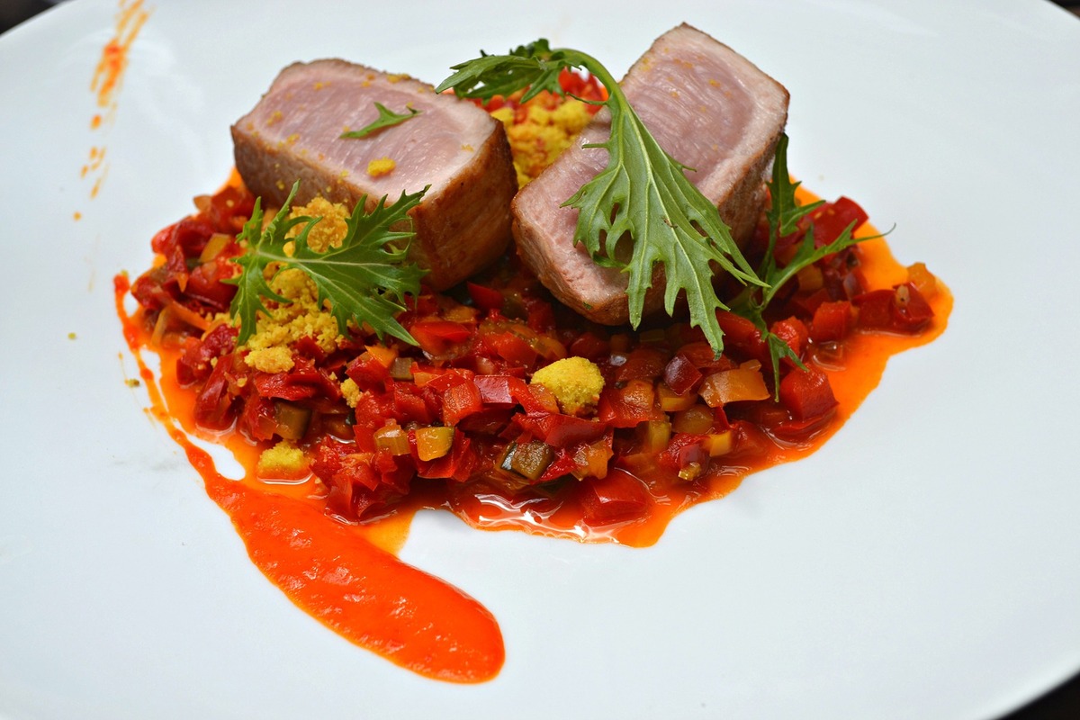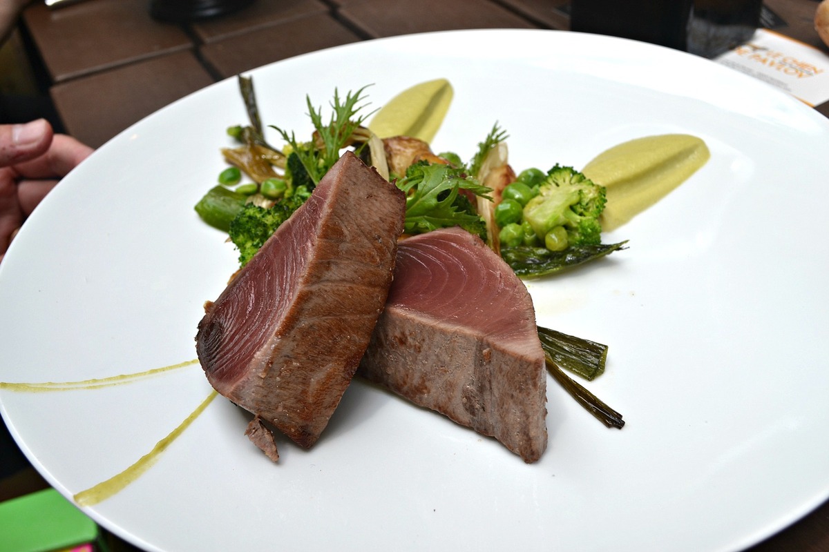 Les autres plats ? Un pavé de thonine mi cuit, superbement dressé avec ses brocolis et ses légumes. Un quasi de veau et sa tombée de poivrons : un plat un peu facile au premier regard, mais bien twisté grâce à son sablé au curry et son coulis de piquillos.
